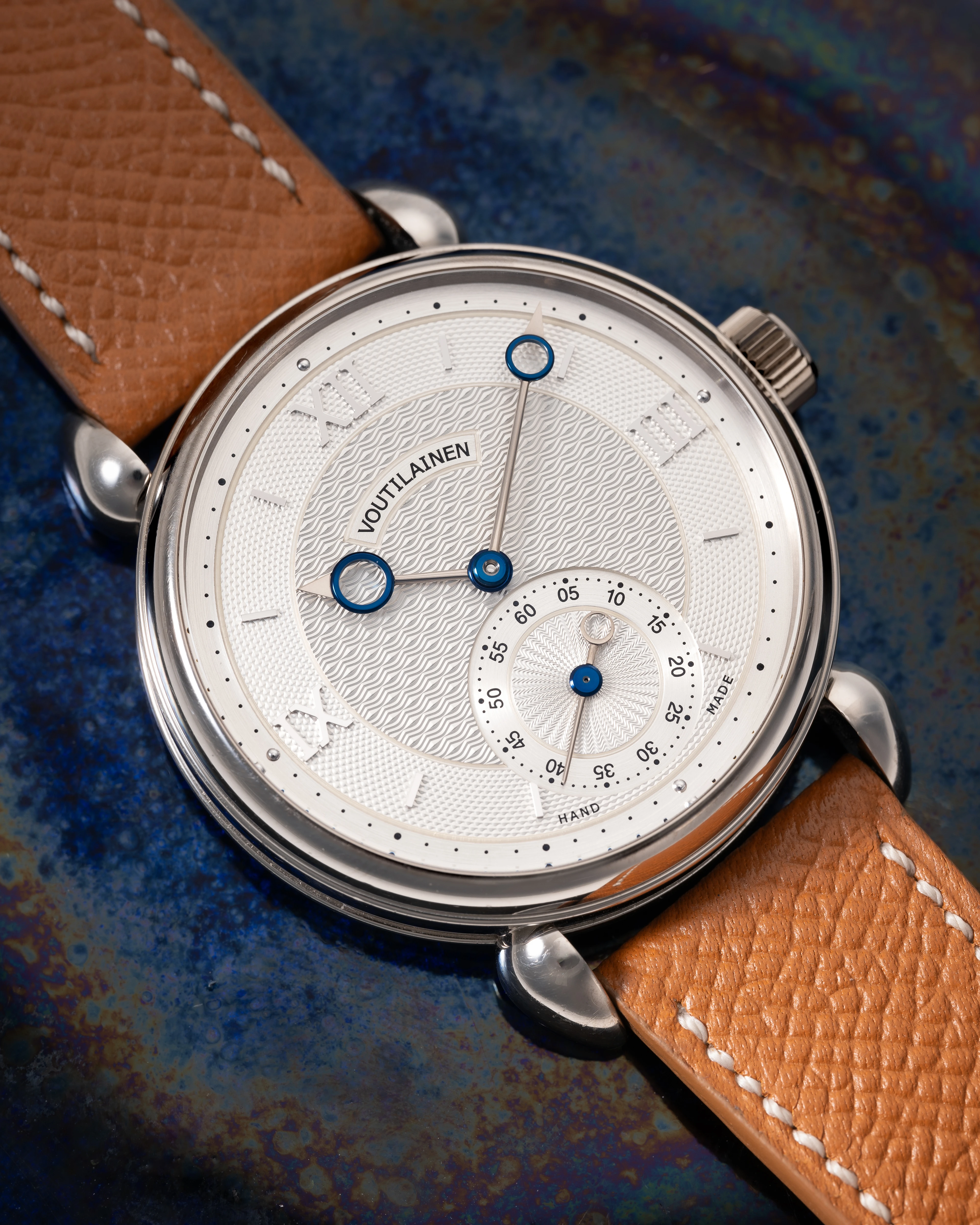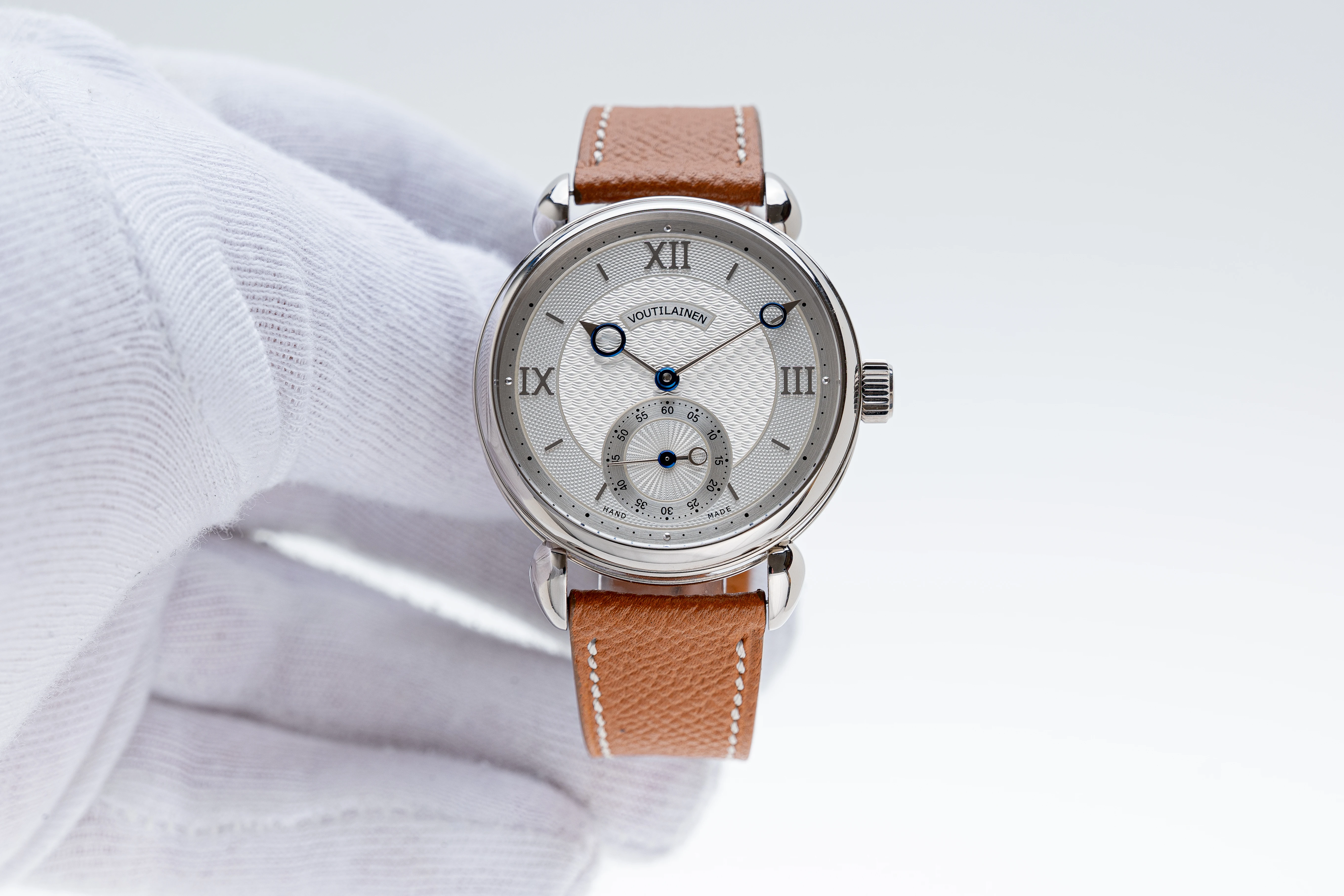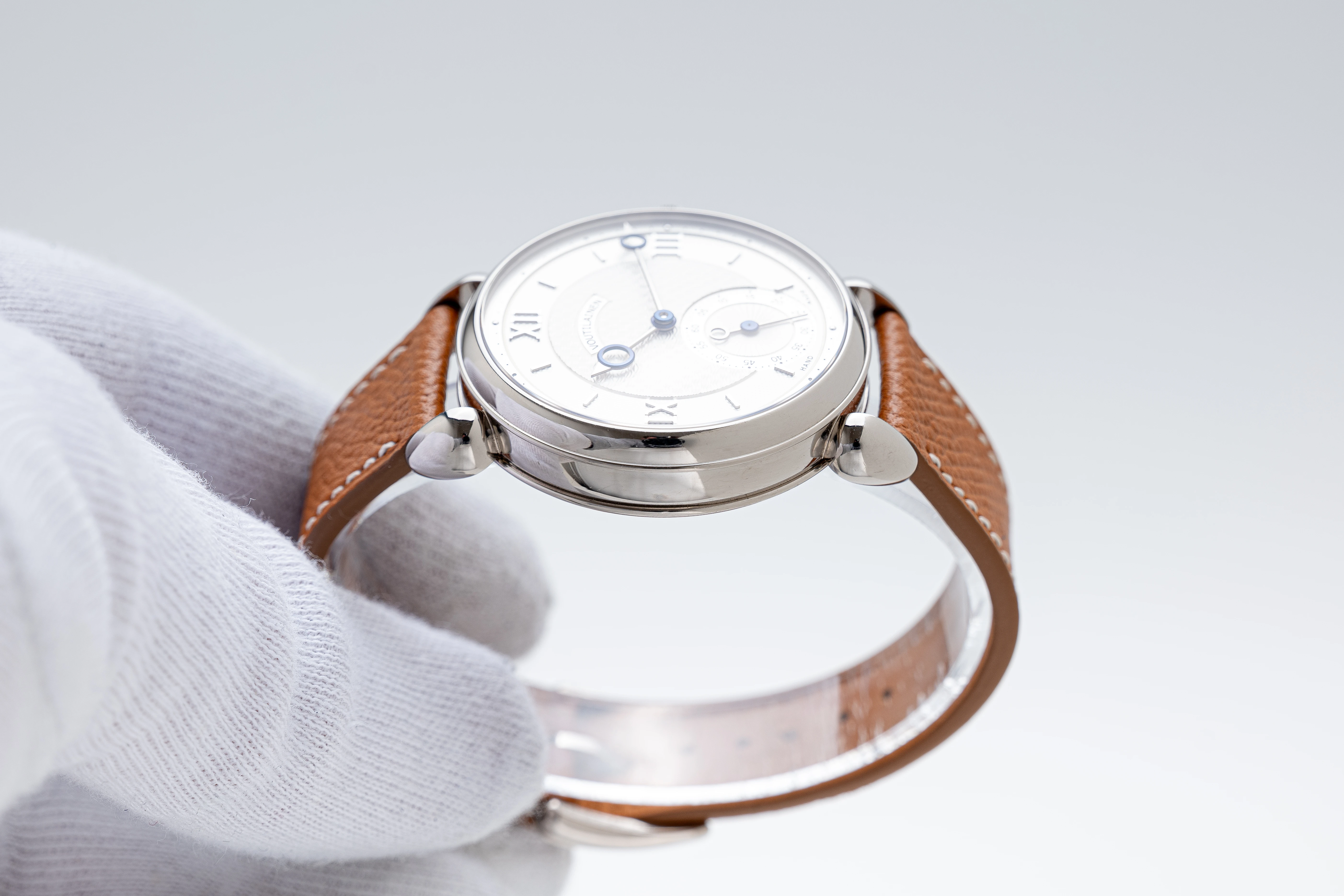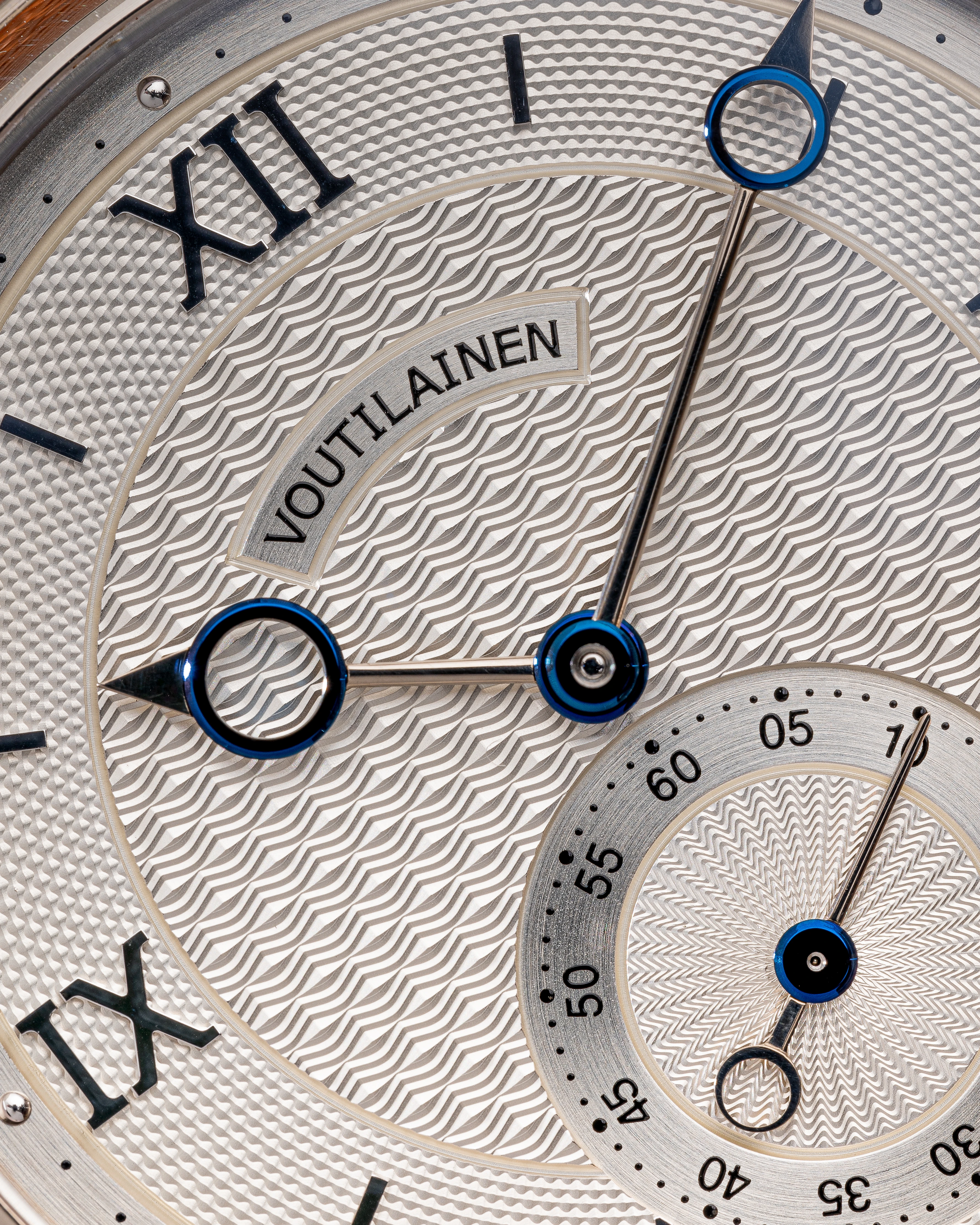 The hallmark of Mr. Voutilainen’s style is of course the high-quality hands, a modernist version of the “Pomme de Breguet” hands, in the elaborated design version, i.e. with a counterweight ring for the small seconds hand. Of course, all the hands are a combination of white gold and blued steel, a design that Mr. Voutilainen adopted at the beginning of his career as an independent watchmaker.