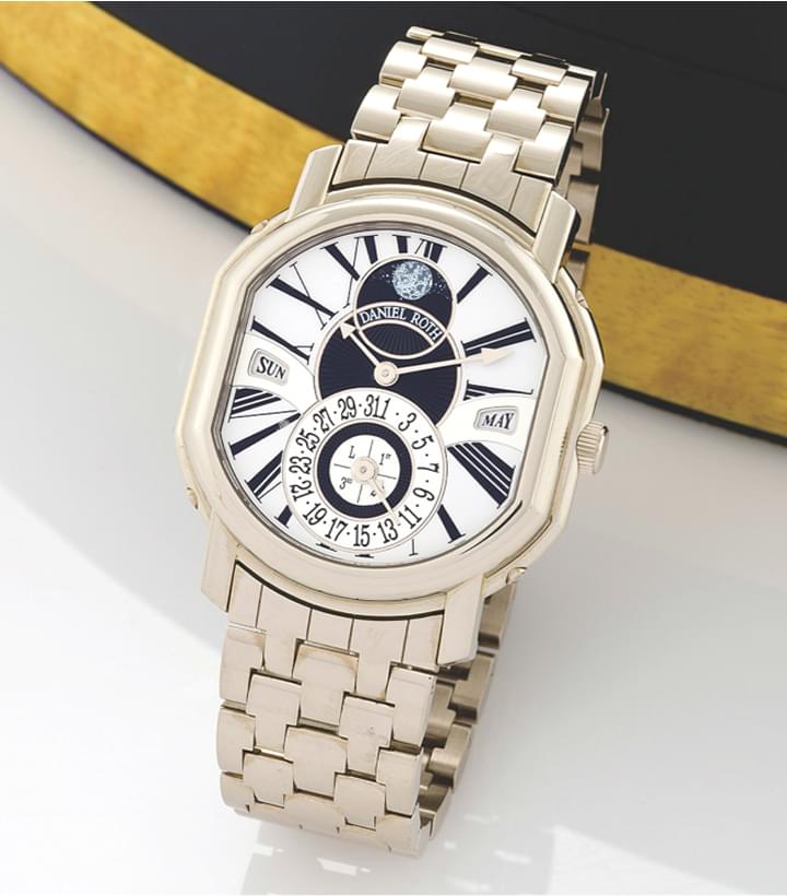 As far as the design codes are concerned, the dial of the Athys Perpetual Calendar Ref. 112.Y is designed in the dynamic New Style, with large black Roman numerals radiating from the center on a white, partially open-worked dial. The openings for the day of the week and the month are located on “wings” that extend from a large date and leap year sub-dial, whose openwork structure and the leap year wheel underneath feature a swirl design. This is the last perpetual calendar to bear the Daniel Roth logo. It was announced just one year before the brand ceased trading. Apparently, Daniel Roth planned several versions, at least the models in 18k rose and white gold. This is indirectly confirmed by photos of the perpetual calendar module with mainplate in rose gold-colored and silver-colored versions that appeared in the press. Although only the Ref. 112.Y.50 is documented with a rose gold case, this was apparently a prototype made for exhibition purposes. No Athys Perpetual Calendar Ref. 112.Y has appeared on the secondary market.