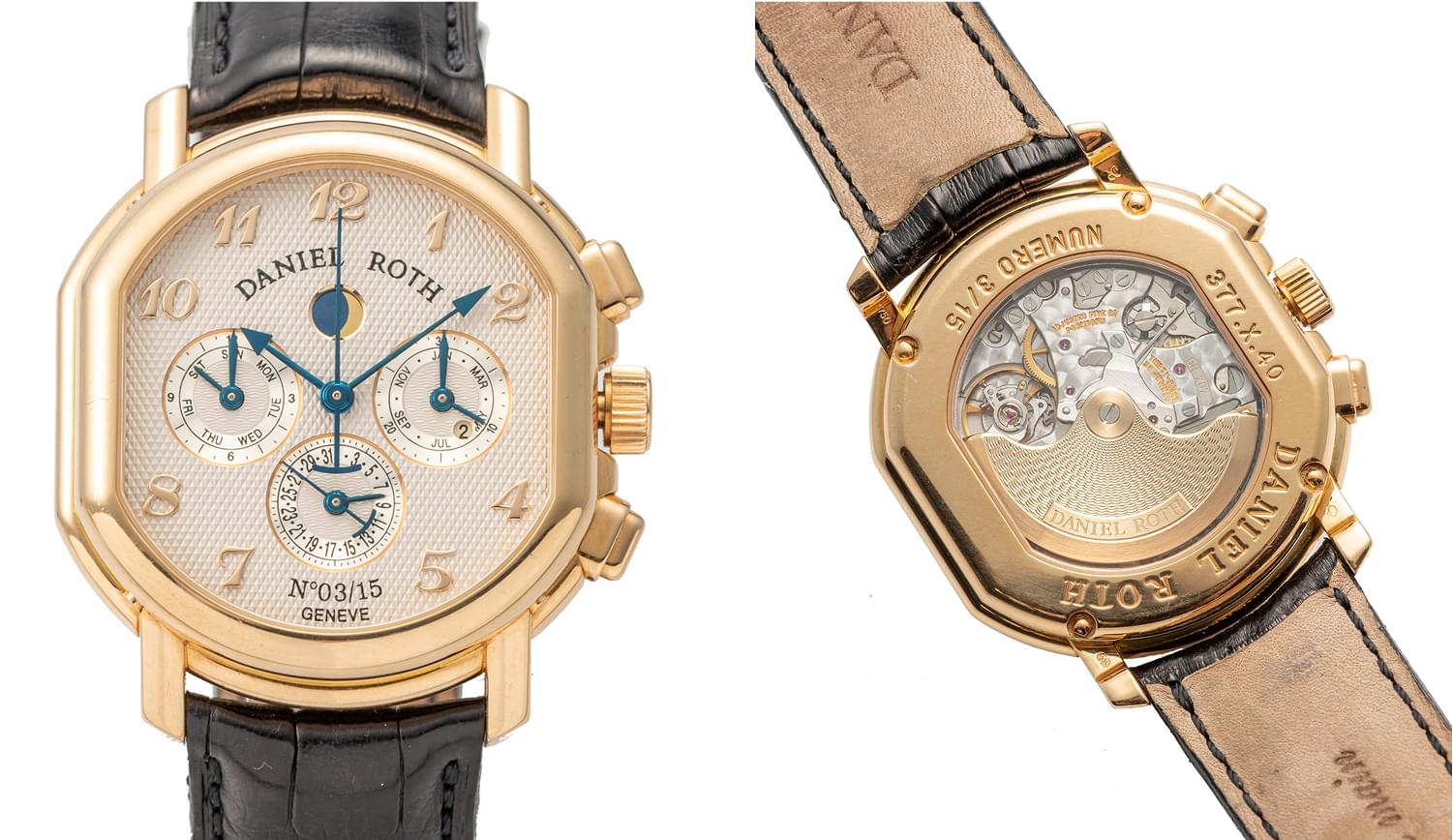 This watch has a combination of a perpetual calendar and a chronograph, which is extremely rare for Daniel Roth. In this context, it is unclear why the brand, which caters primarily to the collector community, did not use the classic high-end hand-wound Lémania 2320 chronograph as a base, which was previously used in the Ref. 2147, and instead opted for the Frédéric Piguet 11.85 automatic column-wheel chronograph with vertical clutch. The only reason for this seems to be to offer the everyday wearer a practical wristwatch with a perpetual calendar that does not have to be wound by hand. This movement formed the basis for the Daniel Roth perpetual calendar chronograph Ref. 377.X, launched in 2002, and its automatic caliber DR207, which used an Eta/Gérald Genta calendar module with the original specifications, i.e. with a leap year on the sub-dial of the month and with moonphase. The module was most likely adapted for the Frédéric Piguet 11.85. The placement of the leap year indication on the month sub-dial is the main difference between this module and the modified versions for references 2117, 119 and 118, where the leap year indication is on the date sub-dial. The use of the Eta/Gérald Genta calendar module with its original display arrangement distinguishes the Ref. 377.X from the perpetual calendars and chronographs of other brands that are based on the Frédéric Piguet 11.85. The Ref. 377.X was offered in two limited editions of 15 pieces: Ref. 377.X.40 in 18k yellow gold and Ref. 377.X.60 in 18k white gold with a guilloché dial with a lozenge motif and guilloché vieux panier on the recessed counters. The dial features applied Breguet Arabic numerals, which are rarely found on Daniel Roth dials.