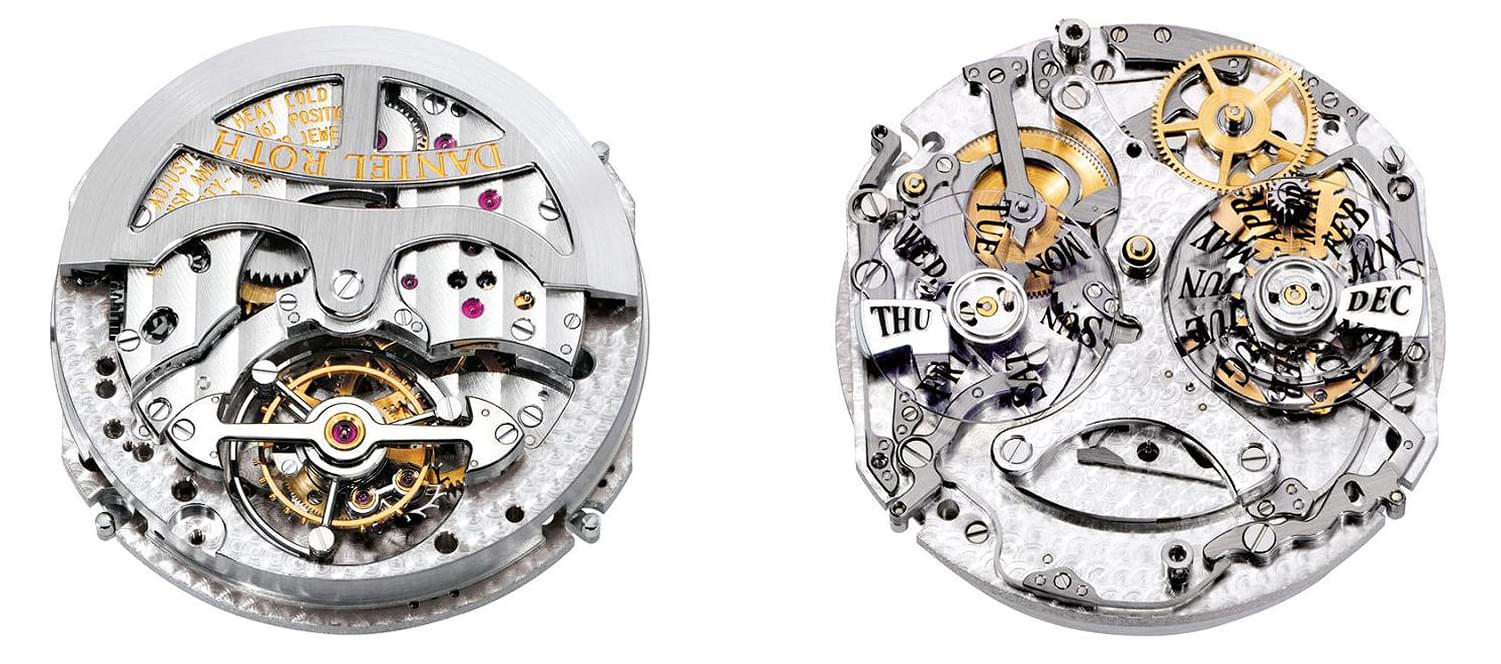 Let’s take a look at the scenario for the introduction of other complications when the Daniel Roth collection was founded and in the early years of the brand. In the case of the tourbillon, Mr. Roth reported that he shared the cost of developing the tourbillon caliber with Breguet. He developed the movement jointly with Lémania, so that the different versions of the same movement were used both at Breguet in the Ref. 3350 (initially) and later in several other references, as well as in the Daniel Roth Ref. 2187/2186 Tourbillons. Mr. Roth did the same when he created the Daniel Roth Ref. 2147 Chronograph with the Lémania caliber 2320, which was also the basis for the Breguet Ref. 3230 Chronograph he had previously developed. In a seemingly completely analog situation, the launch of his Daniel Roth Ref. 2117 Perpetual Calendar was a absolutely different scenario. Mr. Roth decided not to use the early Breguet design. That is, he eschewed the traditional layout with the sub-dials at 12, 3, 6 and 9 o’clock forming a cross-shaped structure and the use of the basic Frédéric Piguet 71 automatic caliber, opting instead for the Lémania 8810 automatic caliber. He did not use the perpetual calendar module he had developed for the Breguet Ref. 3050, nor did he develop a new module in its footsteps. Instead, he opted for the Eta/Gérald Genta perpetual calendar module and commissioned Philippe Dufour, then an up-and-coming independent watchmaker, to adapt and modify it. In an interview with acollectedman.com, Mr. Roth explains: “Dufour was not the mythical watchmaker he is now. He needed some work, so I developed the perpetual calendar with him using the Gérald Genta perpetual calendar as a base movement, which I knew well.”