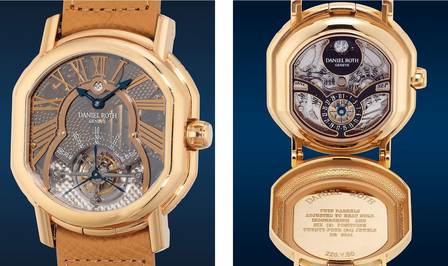 Daniel Roth has launched three main versions of the Tourbillon 8 Jours Double Face Perpetual Calendar: with an 18k yellow gold case and a smoked crystal dial (Ref. 220.Y.20.146.CN.BD; there may have been a typing error in the press release and the reference should start with 220.Y.40 ); in 18k rose gold with a smoked crystal dial (Ref. 220.Y.50.144.CB.BD); in platinum 950 with a lavender crystal dial (Ref. 220.Y.70), of which only a handful were seen on the market. This is a very rare edition, of which probably no more than 30 were produced.