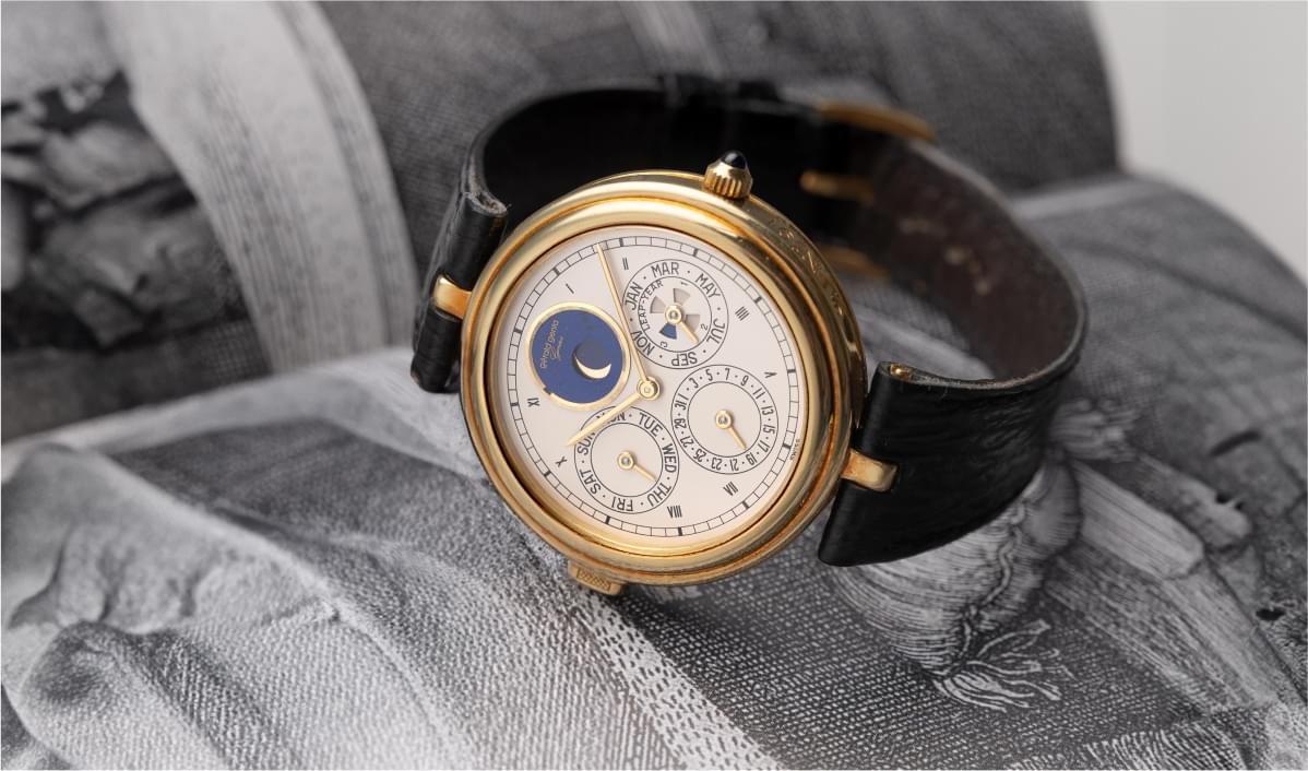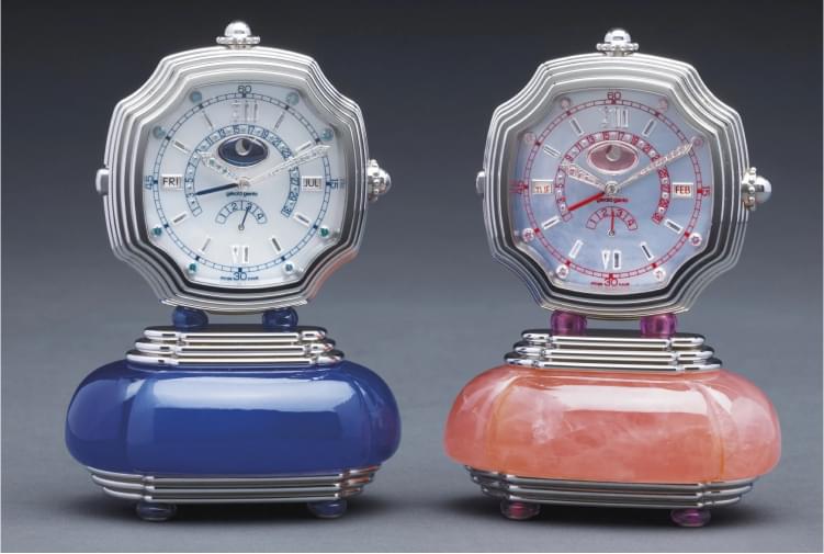 Another extremely attractive and equally rare art object are the desk clocks by Gérald Genta. There are two motives for the production of such objects: firstly, to satisfy the demand of collectors, as with the pocket watches, and secondly, to produce an avant-garde timepiece and thus bring the brand into conversation. For the collector’s timepieces, the brand used pocket calibers with complications, usually a perpetual calendar, often in combination with a minute repeater or Grande Sonnerie. These clocks were made as unique pieces and mostly to order. Information about them is therefore scarce, even if they occasionally appear on the aftermarket. Almost nothing is known about avant-garde models such as the Fantasy ‘Pink Panther’ travel table clock, that the brand announced in 1985; demand and therefore production quantities were probably extremely low.
