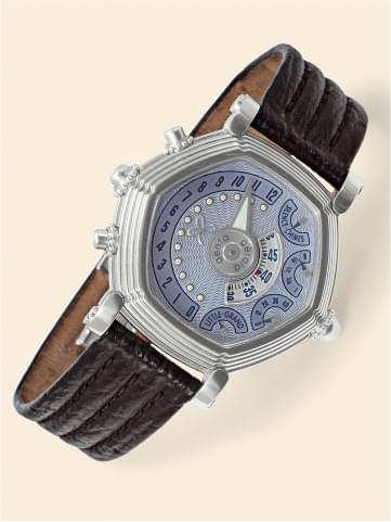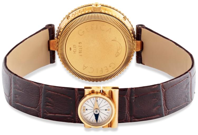 The original version of the Géfica Safari features a multifunction quartz caliber with date, day of the week, moonphase, 24-hour GMT display and alarm functions. The clasp of this watch has an unusual design, as it is equipped with a portable magnetic compass. Géfica watches are everything a safari hunter needs.
