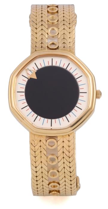 The same applies to the Octagonal Kaleidoscope watch. This design was launched around 1983. Of the two known versions, the Kaleidoscope Ref. G2705.7 with central disc hour display is particularly attractive to my taste. There are no other hands on the dial. Perhaps this is the only single-hand watch that Mr. Genta designed for his brand. You could say that this watch is unfortunately equipped with a quartz caliber and not a mechanical one, but that was just the way of the times: quartz movements were considered the last word in watch technology in the 1980s. Add the last word in watch design here and we get the perfect watch. Please note, this watch has a perfect pair: I have the suspicion that the Audemars Piguet Philosophe watch, also a single-hand watch, was designed by Mr. Genta as well. Just compare the dials.