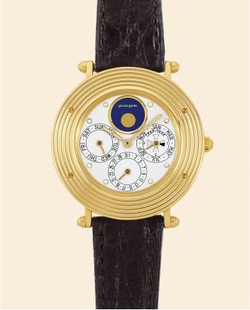 This category partly comprises watches with round cases and straight lugs, a modernized version of the Empire style once developed by Abraham-Louis Breguet for pocket watches and adapted by the brand for wristwatches in the 20th century. Mentioning the name Breguet in this context does not seem superfluous, as Mr. Genta himself mentioned in his interview that he developed designs for this brand, which was relaunched during the period when it was owned by Chaumet. It would be useful and revealing to find further evidence of this fact in addition to the statements of the master himself. Among Gérald Genta’s watches, we find only a few instances that refer directly to the Breguet style. The earliest are the rare examples such as the Classic Complete Calendar watch from around 1983, which features a ribbed caseband. The same feature was perhaps used in Mr. Genta’s most recent activity for his brand, namely in the design of the Rétro Classic and the Classic in the 1996 version. The ribbed caseband of these watches is the most conspicuous reference to the Breguet style, which has been implemented in almost all Rétro Classic and Classic (Arena) watches since 1996. At the same time, other important elements of the Breguet style, namely Breguet numerals, Breguet hands and a Breguet-style guilloché dial, are not found on Gérald Genta watches. The only exceptions are a few examples of round and tonneau-shaped self-winding watches with retrograde perpetual calendar and minute repeater, e.g. Ref. G4042, made from 1993 to 1996, and the Grande Sonnerie Ref. G0026 from 1996, whose dials feature applied Breguet Arabic numerals.