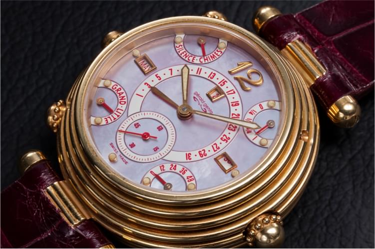 The development of the Grande Sonnerie watch and its highly complex self-winding movement was completed in 1994 to mark the brand’s 25th anniversary. The watch was touted as the most complex wristwatch in the world, and it was. Mr. Genta mentioned in an interview that he had sold 23 examples for one million Swiss francs each. It probably dates from 1994 to 1996 or 1997. Later, according to Gérald Genta’s staff, the brand produced at least one Grande Sonnerie watch per year thereafter.